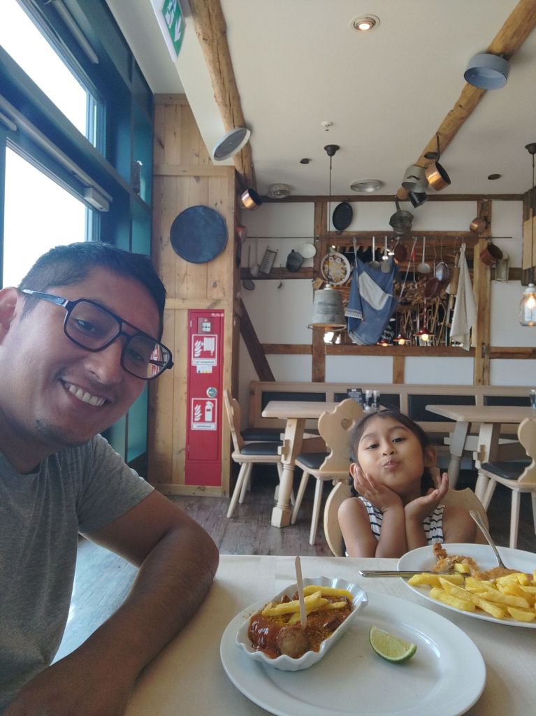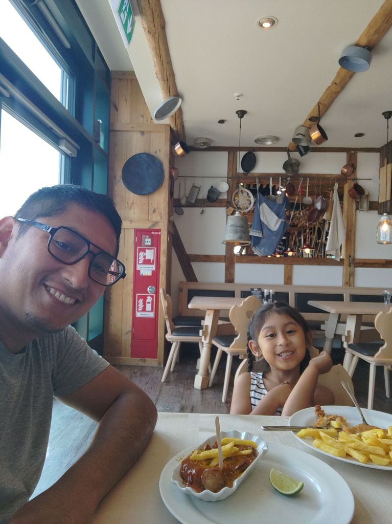 Entramos primero a la tienda de bicis. Emma llevaba 10 euros que había ahorrado en su hucha y se compró dos helados de hielo. Mientras ella los disfrutaba, yo aproveché para comprar el pedal que le faltaba a su bicicleta de 20 pulgadas. Después, nos fuimos a la tienda de muebles. Qué ingenuos fuimos pensando en comprar una cómoda y traerla en el remolque. No encontramos ninguna, pero sí almorzamos allí: un schnitzel para Emma y una Bratwurst para mí. Ella, al ver que yo solo tenía una salchicha, compartió sus patatas fritas conmigo.